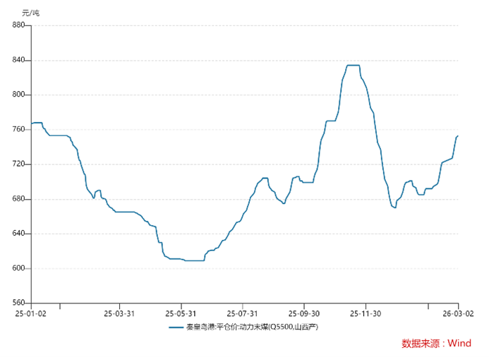 据中国煤炭市场网,截至2月28日秦皇岛港口Q4500、Q5000、Q5500动力煤现货价收报584、670、751 元/吨,环比上涨 24、28、29 元/吨,延续了开年以来的反弹表现。