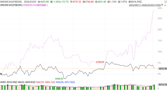 进入2026年以来,中证煤炭指数(000820.SZ)持续反弹,而在中东地缘局势剧变之后,近日煤炭指数加速上涨,YTD已超24%,大幅跑赢沪深300近23个百分点。其中,龙头中煤能源已创出历史新高。