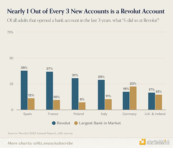 曾经只提供单一产品、地域集中且可有可无的服务,如今已发展成为一家功能齐全的商业和个人银行,在欧洲(Revolut 目前的主要运营地区)新开账户中约有 1/3 被 Revolut 占据: