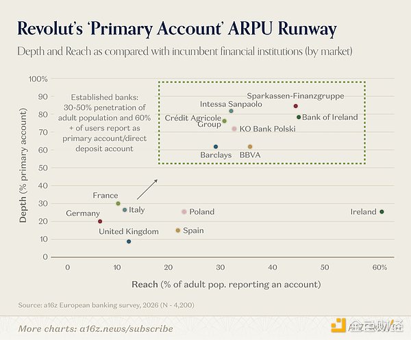 为了说明这一点,让我们来看看 Revolut 目前在覆盖范围(即渗透率)和深度(即主要银行份额)方面所处的位置: