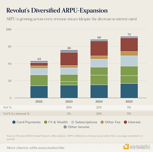 资料来源:Revolut年度报告,a16z分析。ARPU定义为各产品线收入/该期间内平均每位用户收入。