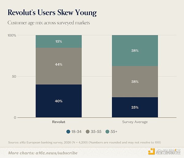值得注意的是,根据我们的调查,约有25%的35岁以下Revolut用户将Revolut作为他们的主要账户。我们稍后会详细讨论这一点,但抛开其他因素不谈,仅仅是这一群体的成熟就应该会对欧洲银行业市场份额的未来产生深远的影响。