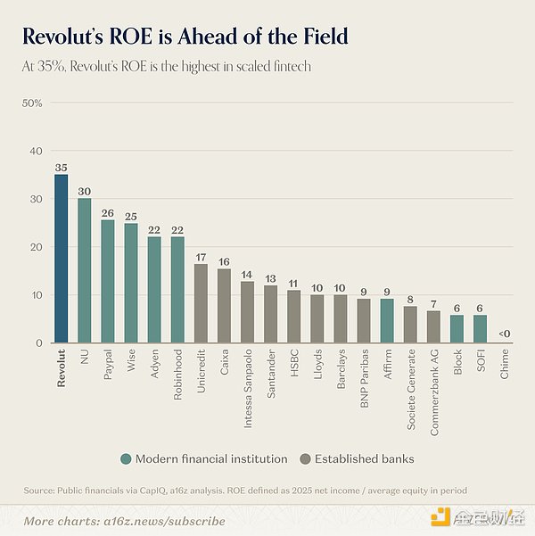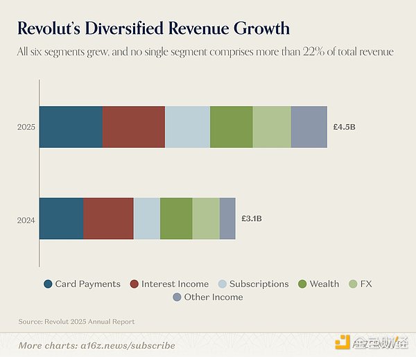 资料来源:Revolut 2025 年年度报告,a16z 分析。收入按年末汇率折算为美元。NU 收入已扣除利息和预期信用损失。