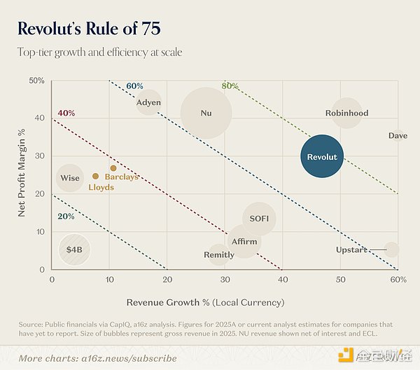2025年,Revolut实现了46%的营收增长和29%的净利润率,由此得出X法则(增长率+利润率)为75%。这下40法则失效了!