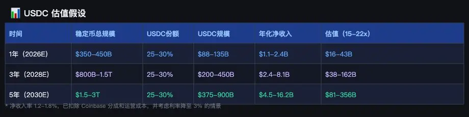 USDC 按 40% CAGR 到 2028 年约 $200-300B。即使利率降到 3%,$250B × 1.5% 净利差 = $37.5 亿净收入。给 20x,市值 $750 亿。从当前 $150-200 亿到 $750 亿,约 4x。不需要 CPN 或 Arc 做任何贡献。