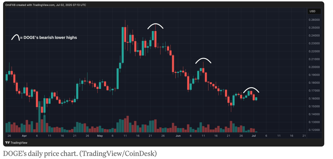 DOGE (DOGE) شكل نمط قاع مزدوج واضح في نطاق 0.157 دولار إلى 0.158 دولار، مع حجم تداول أعلى من المتوسط، خاصة خلال الفترة من 13:00 إلى 14:00 في 1 يوليو.