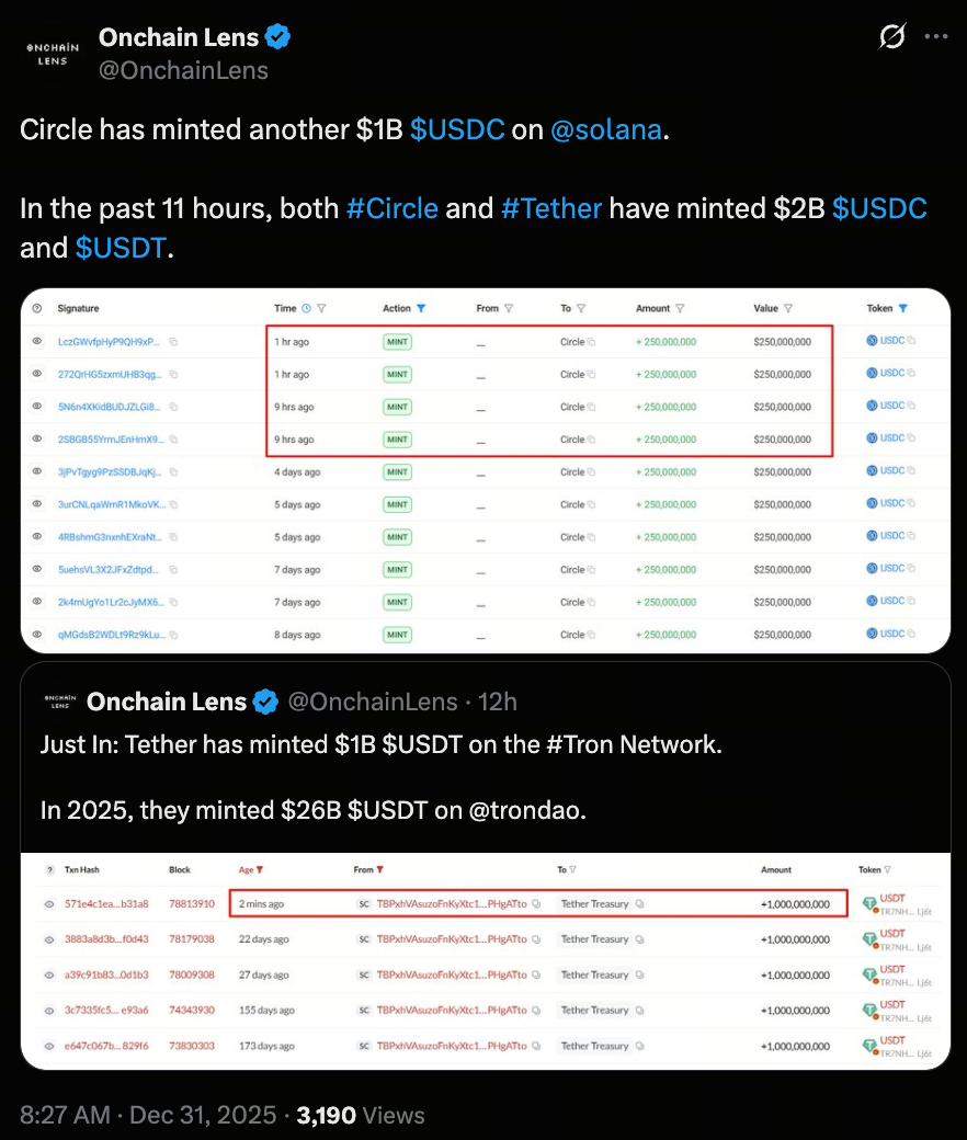Onchain Lens, plataforma de análisis on-chain, informó que Circle acuñó 1 000 millones adicionales de USDC en la blockchain de Solana el 31 de diciembre, completando el proceso en solo unas horas. En un periodo más amplio, Circle y Tether emitieron conjuntamente cerca de 2 000 millones en USDC y USDT durante las últimas 11 horas, lo que pone de manifiesto la rápida expansión de la oferta de stablecoins.