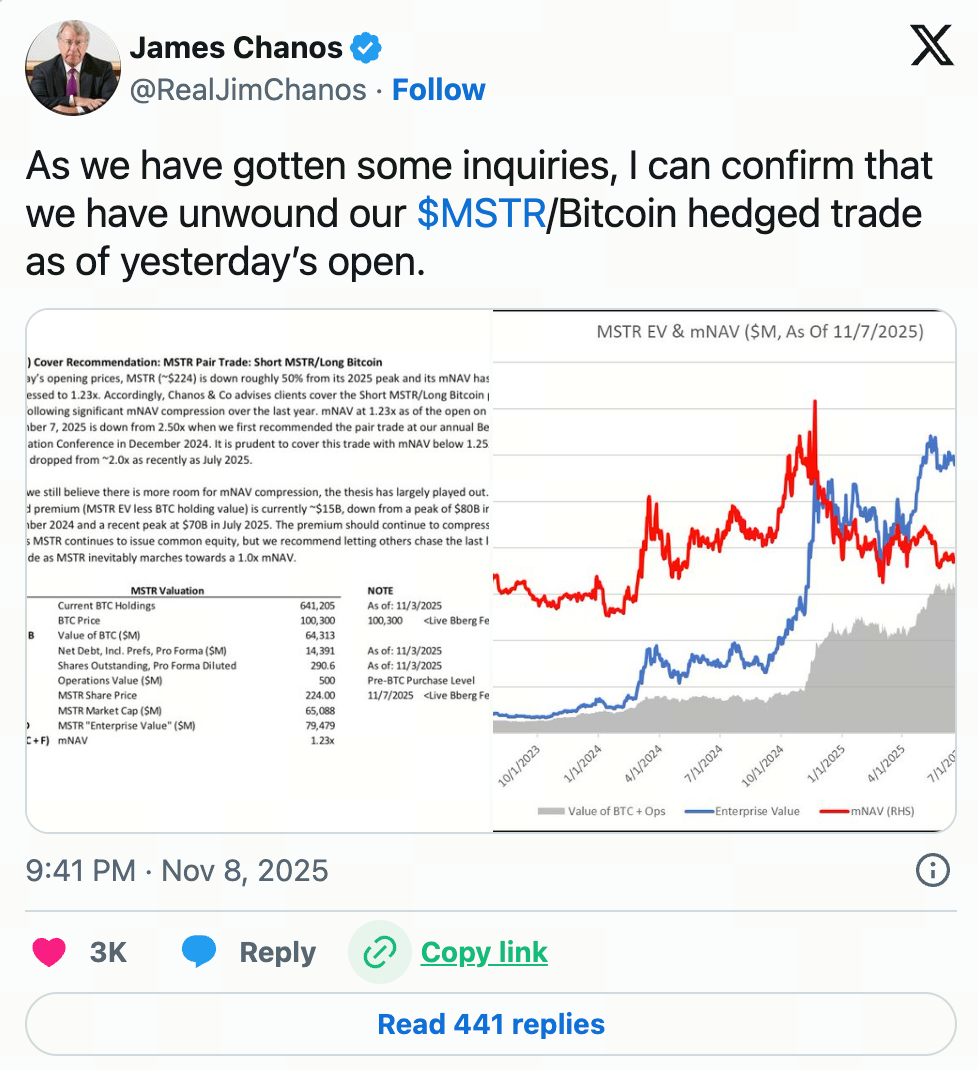 Chanos a régulièrement souligné que les ventes dilutives de MicroStrategy — vendre massivement son propre mNAV pour acquérir du BTC — ont été le déclencheur qui l’a poussé à mettre en place sa stratégie à deux volets.
