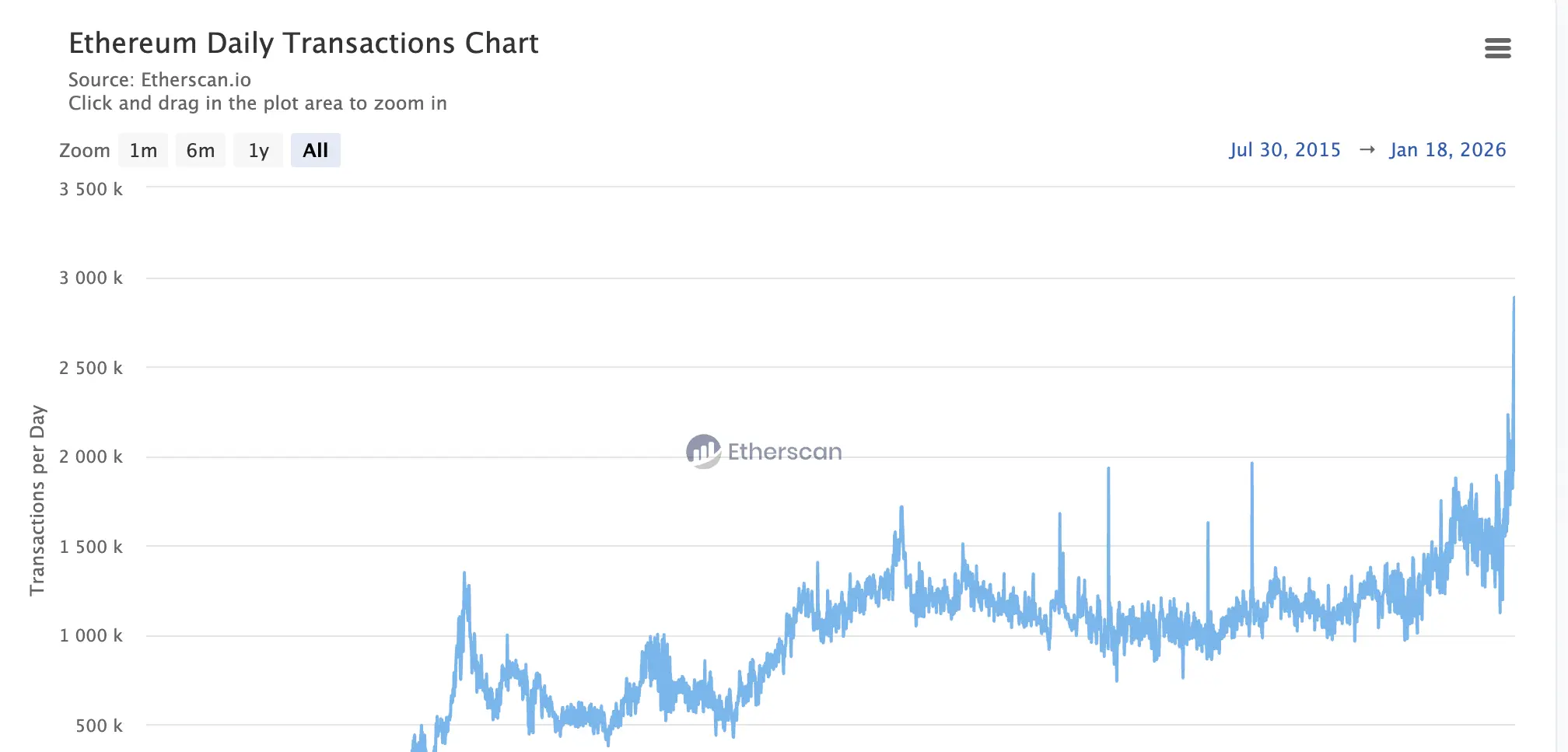 Le réseau a traité un record de 2 885 524 transactions vendredi, le nombre quotidien le plus élevé de son histoire. Cette hausse marque une forte reprise de l’activité sur la chaîne ce mois-ci, avec des volumes de transactions atteignant de nouveaux sommets jusqu’au début de 2026.
