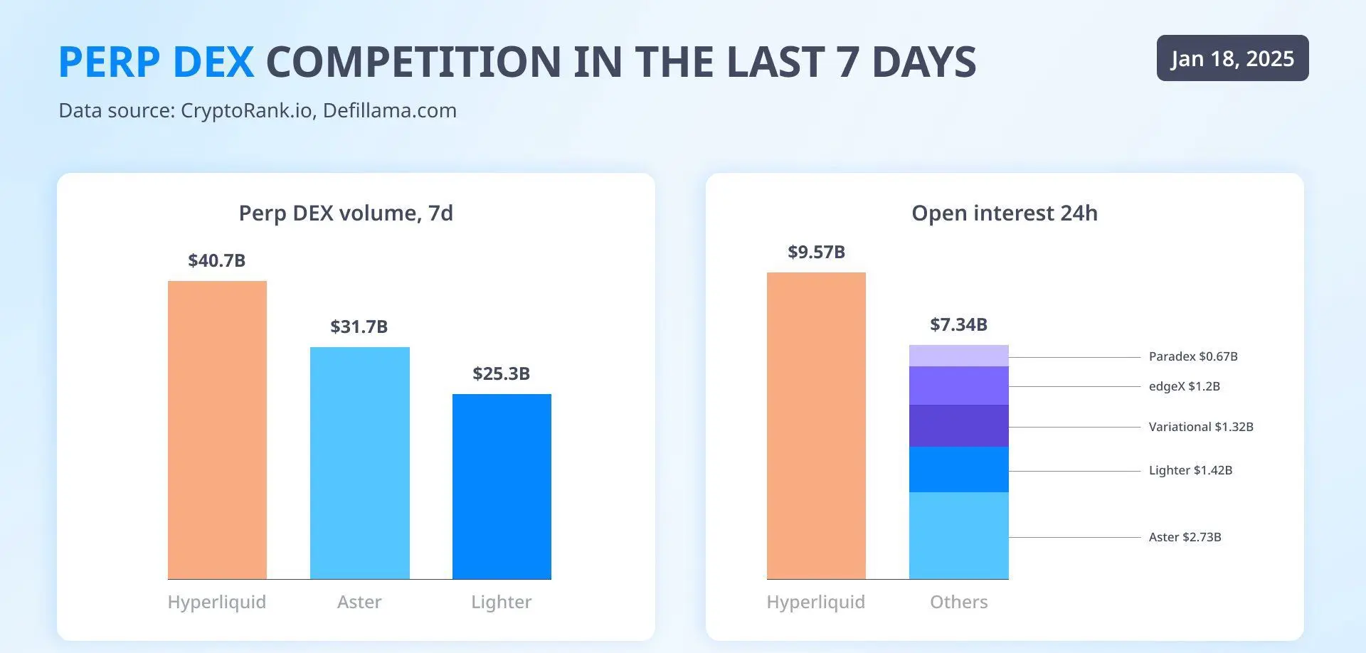 Au cours des sept derniers jours, Hyperliquid a traité environ 40,7 milliards de dollars en volume de trading perpétuel, selon les données de CryptoRank et DefiLlama, dépassant Aster à 31,7 milliards de dollars et Lighter à 25,3 milliards de dollars.
