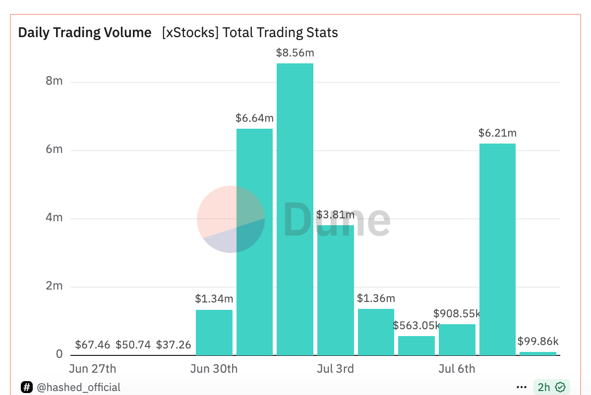 株式トークン化プラットフォームxStocksの単日の取引高は621万ドルに達し、トークン化されたTSLとCircleの取引高が上位に入っています。