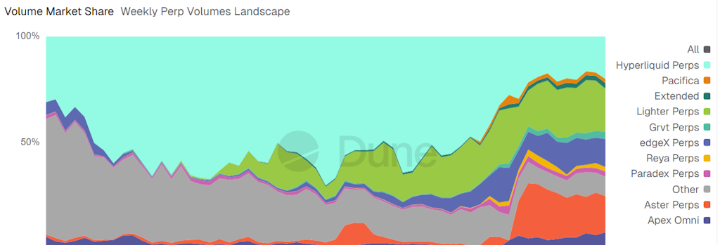 パフォーマンスのピークは、Asterのローンチとほぼ一致しており、これがすぐに市場シェアと注目を集め、Hyperliquidから引き離した。9月中旬以降、Hyperliquidの永続先物取引量に占めるシェアは49%から現在の19%に低下した。その大部分はAsterとLighterに奪われており、Lighterは10月中旬以降、週次取引量でわずかにHyperliquidを上回ることもある。