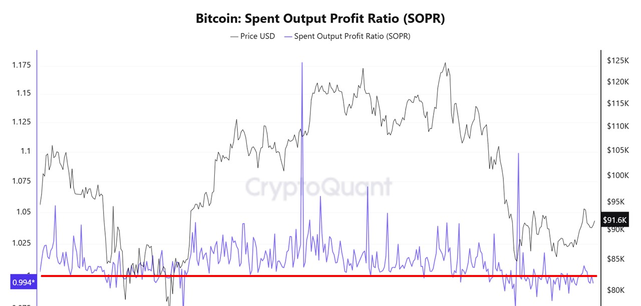 もう一つの重要な指標であるSOPRは、コインがほとんど動いておらず、利益確定も限定的であることを示しています。簡単に言えば、投資家は取引よりも保有を選んでいるということです。これは忍耐を示しており、恐怖ではありません。