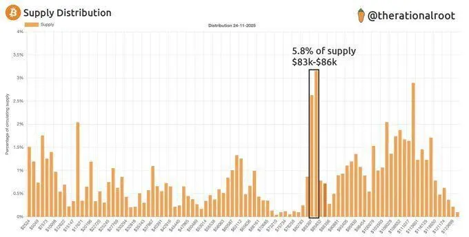 A mais recente venda de Bitcoin está deixando algumas impressões incomuns na blockchain. Novos dados on-chain mostram que uma única faixa de preço, $83,000 a $86,000, absorveu 5.8% de toda a oferta de BTC em circulação durante o recente pico de volatilidade. Para comparação, eventos de redistribuição dessa magnitude ocorrem apenas algumas vezes por ciclo e estão tipicamente ligados à capitulação emocional, não ao início de uma queda prolongada.