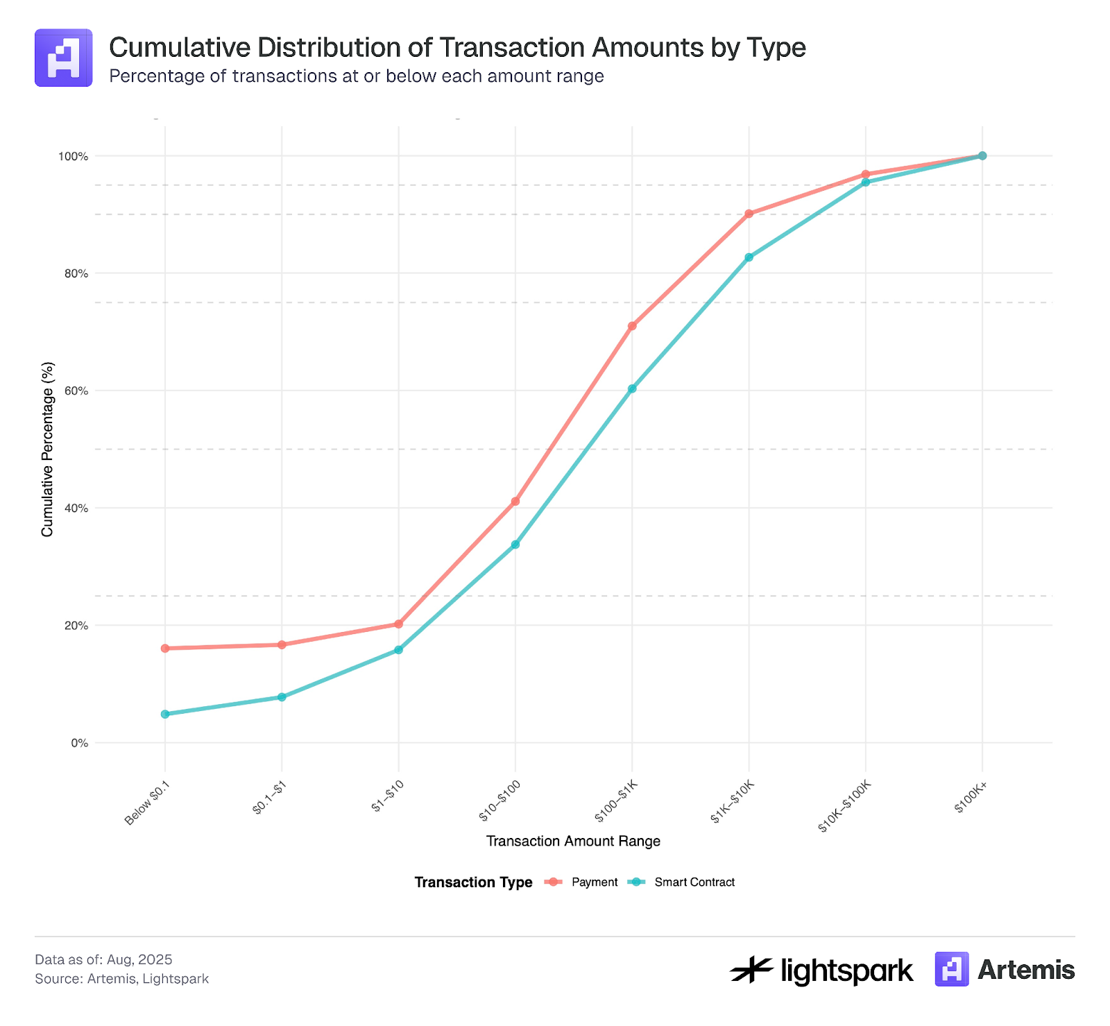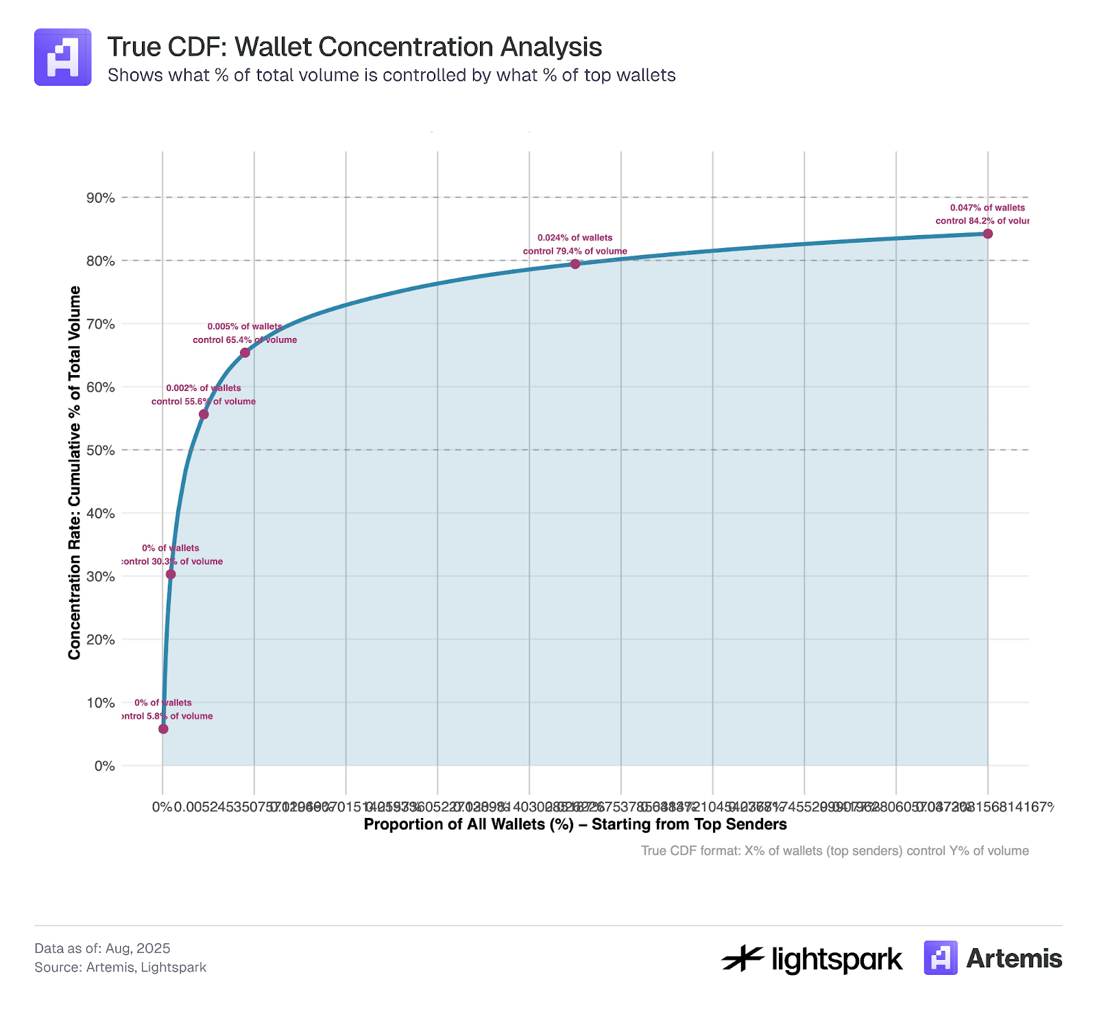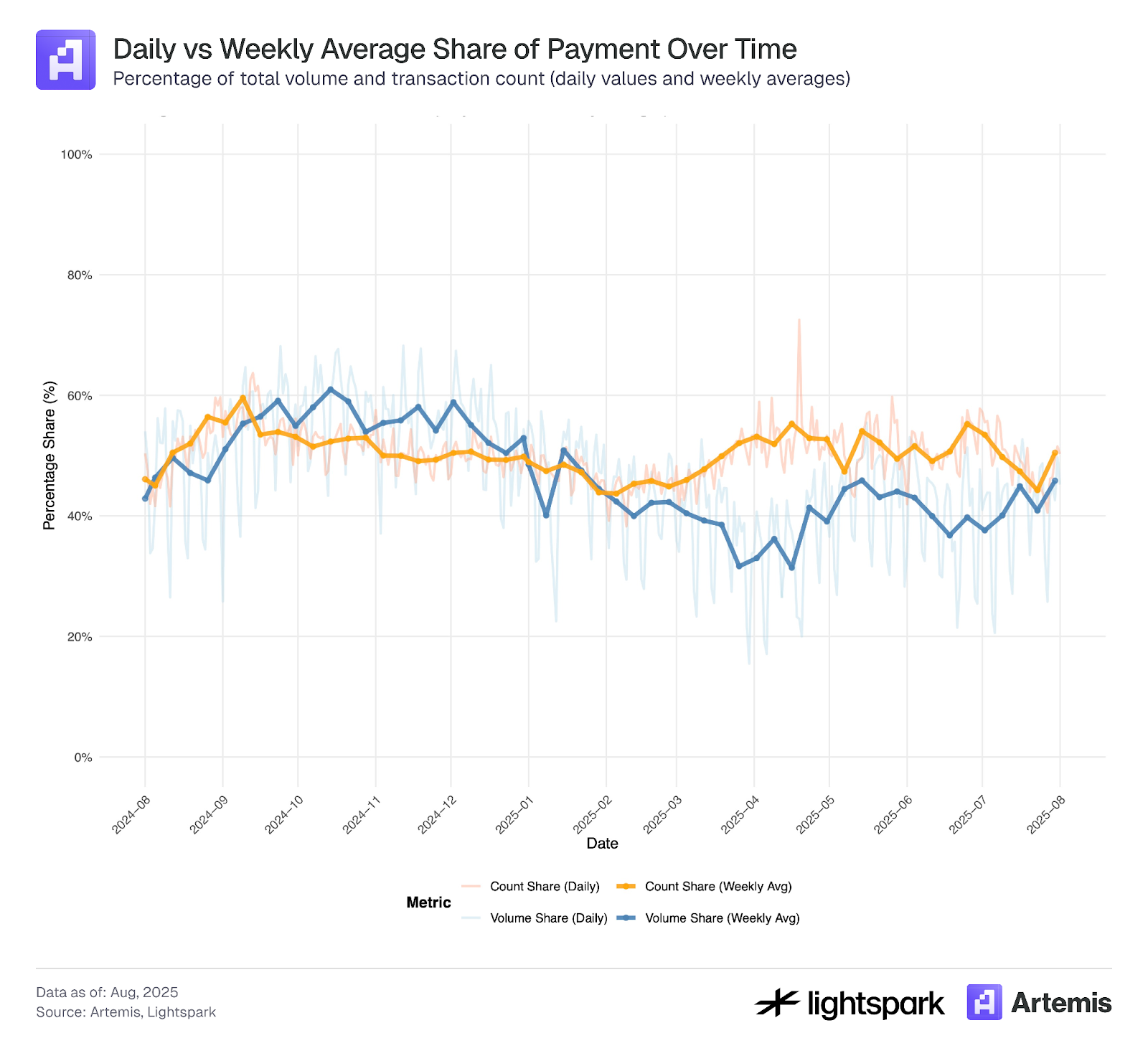 As stablecoins registam uma adoção crescente, com aumentos significativos no volume e número de transações, duplicando entre agosto de 2024 e agosto de 2025. A estimativa do uso das stablecoins para pagamentos permanece desafiante, mas novas ferramentas contribuem para aperfeiçoar esta avaliação. Este trabalho clarifica e estima o uso das stablecoins em pagamentos documentados na blockchain (Ethereum), recorrendo à rotulagem Artemis. Estimamos que os pagamentos com stablecoins representam 47 % (35 % excluindo Internal B) do volume total (dados brutos). Esta estimativa pode ser considerada um limite superior, dado o menor grau de restrição na classificação dos pagamentos face à mera transferência EOA-EOA. Investigadores podem aplicar filtros adicionais, como limites de valor, em função dos objetivos analíticos. Por exemplo, excluir operações inferiores a 0,1 dólar permite ignorar manipulação de baixo valor (ver secção 3.1).
