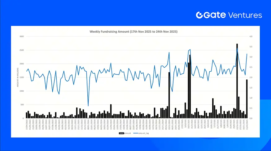 Na terceira semana de novembro de 2025, o total de financiamento aumentou para 1,41 mil milhões de dólares, um crescimento de 968% em relação ao mês anterior. Em comparação com o mesmo período do ano passado, o financiamento semanal cresceu 279%.