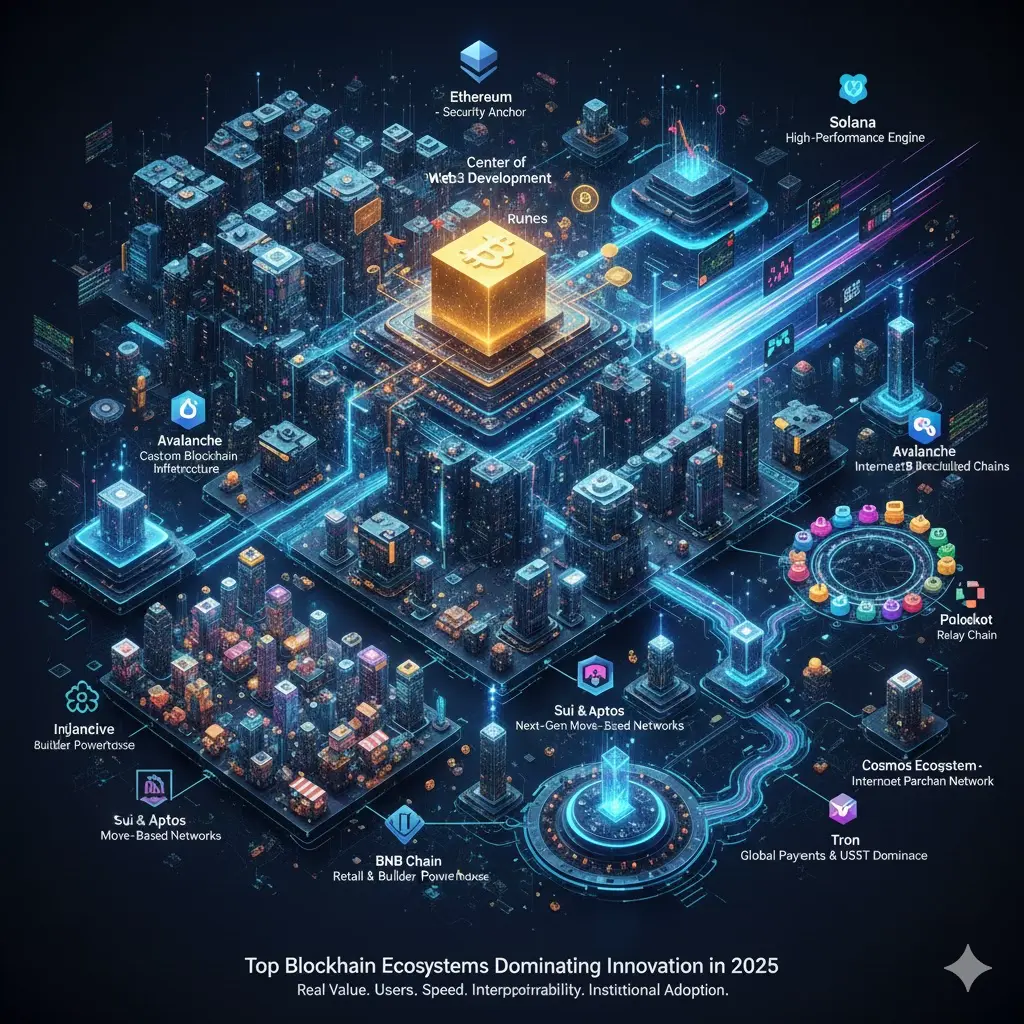 Блокчейн в 2025 году определяется не хайпом, а экосистемами, которые стали зрелыми, масштабируемыми и доказали свою реальную ценность. По мере ускорения внедрения в сферах DeFi, реальных активов, гейминга, ИИ и кроссчейн-инфраструктуры, несколько сетей явно лидируют в инновационном цикле. Эти экосистемы объединяют высокую активность разработчиков, надежную безопасность, быструю обработку и растущий пользовательский спрос.