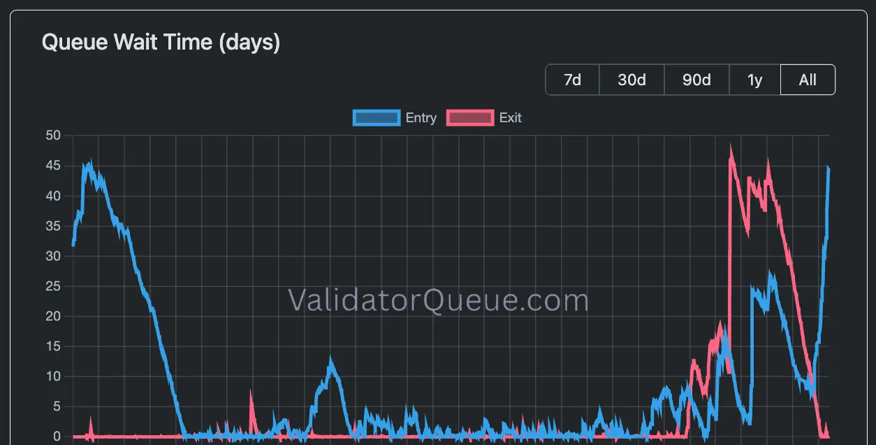 В настоящее время в ожидании активации находятся более 2,55 миллиона эфира, стоимостью примерно $8,3 миллиарда, что соответствует предполагаемому времени ожидания более 44 дней, прежде чем новые валидаторы смогут начать зарабатывать на стейкинге.