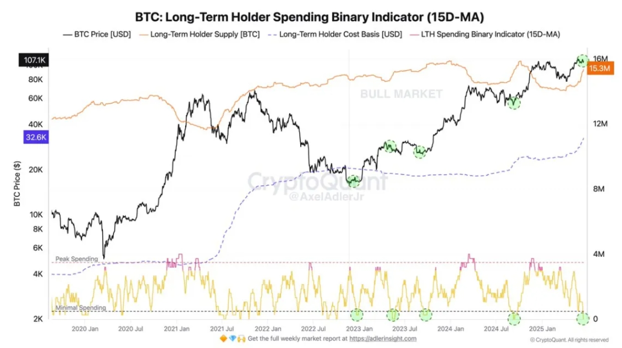 Gate News bot повідомлення, аналітик CryptoQuant Axel Adler вказав на переконливий сигнал у блокчейні, який ще більше підсилив цей оптимізм. Витратна активність усієї групи довгострокових тримачів (LTH) наближається до історичного мінімуму, і цей рівень зазвичай пов’язаний з етапом накопичення. У чотирьох попередніх подібних випадках у трьох з них Біткойн зростав на 18-25% протягом наступних 6-8 тижнів. Це свідчить про те, що досвідчені ходлери мають тверду віру в Біткойн.