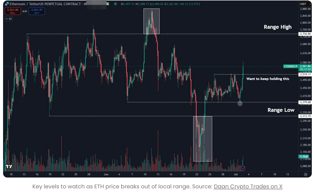 Думка аналітиків: потрібно утримувати ключову підтримку Щодо сьогоднішнього руху, аналітик Daan Crypto Trades зазначив, що ETH демонструє “гарний локальний пробій діапазону”. Але він підкреслив, що бичкам потрібно втримати область 2520 доларів, щоб підтвердити, що це не “ще один фальшивий пробій або пастка ліквідності в більшому коливальному діапазоні”. Якщо ця позиція буде втрачена, ETH, ймовірно, знову опуститься до нижньої межі діапазону. Тому на даний момент ключовий рівень підтримки дивиться на 2310 доларів, рівень спротиву дивиться на 2735 доларів.