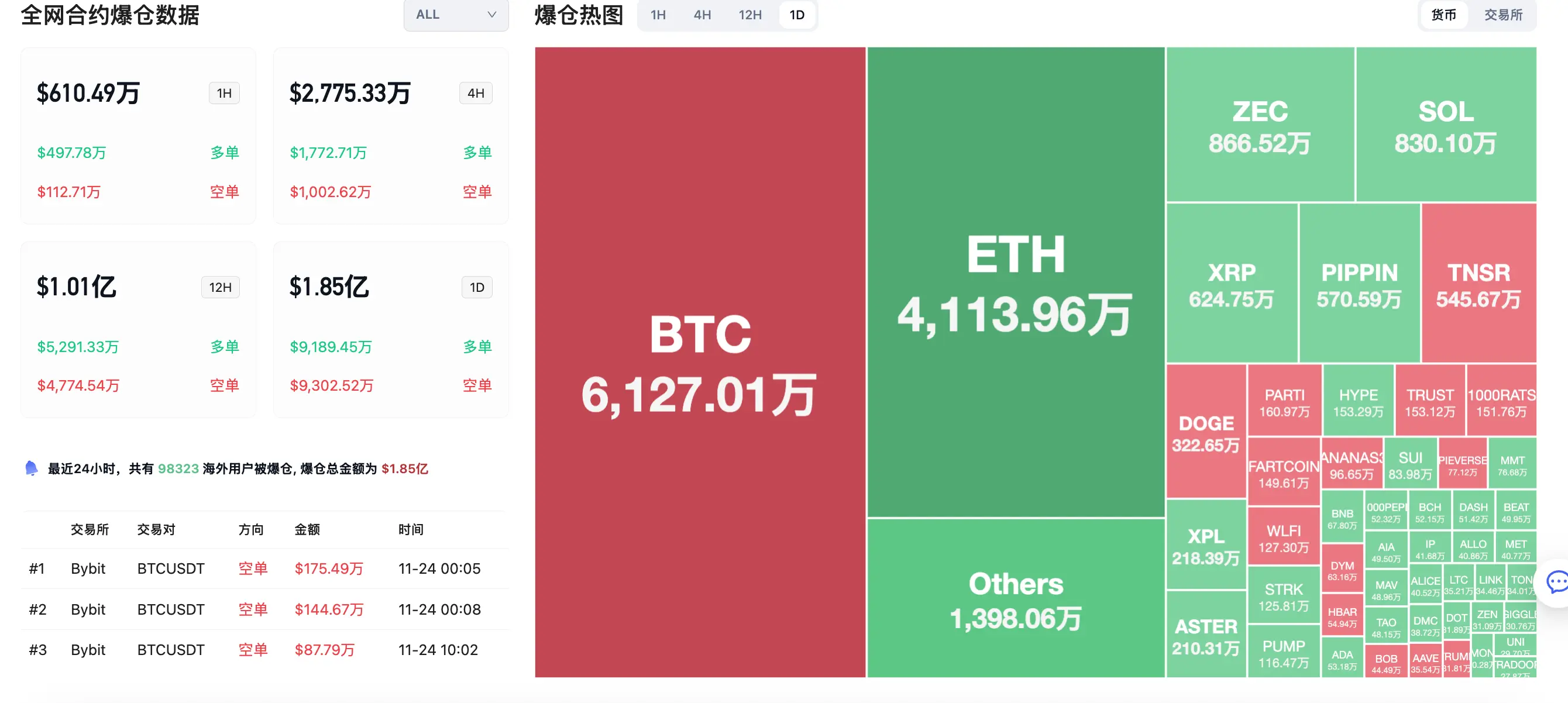 • Dữ liệu thanh lý trong 24 giờ: Trên toàn cầu có tổng cộng 98323 người bị thanh lý, tổng số tiền thanh lý là 185 triệu USD, trong đó thanh lý BTC là 61.27 triệu USD, thanh lý ETH là 41.14 triệu USD, thanh lý ZEC là 8.365 triệu USD