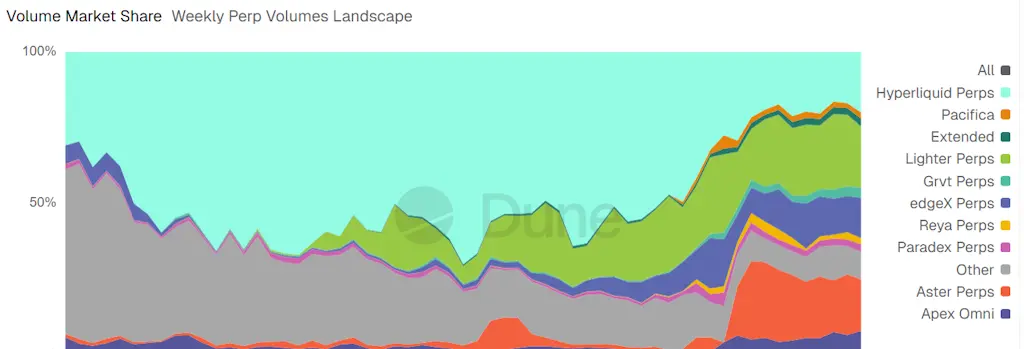 Đỉnh hiệu suất gần như hoàn toàn phù hợp với việc ra mắt Aster, nhanh chóng chiếm lĩnh thị phần và thu hút sự chú ý khỏi Hyperliquid. Từ giữa tháng 9, phần thị phần của Hyperliquid trong khối lượng hợp đồng vĩnh viễn đã giảm từ 49% xuống còn 19% ngày nay. Phần lớn phần mất đi đó đã chuyển sang Aster và Lighter, trong đó Lighter thậm chí còn nhẹ nhàng hơn Hyperliquid trong khối lượng hàng tuần kể từ giữa tháng 10.