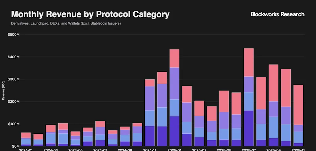 Crypto đã trưởng thành nhanh chóng. Những gì từng là thị trường của các dự án hạ tầng mang tính chất đầu cơ thuần túy đã phát triển thành các dòng doanh thu đa dạng, sinh lời. Doanh thu hàng tháng của các giao thức (trừ stablecoin) trung bình đạt $175 triệu vào năm 2025, tăng 133% so với cùng kỳ năm 2024 là $75 triệu.