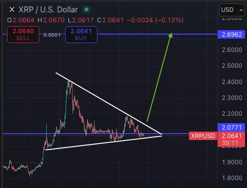 “Nhìn vào XRP trên biểu đồ theo giờ. Một bước đi sắp xảy ra trước cuối tuần,” Bird viết kèm theo một biểu đồ cho thấy hình tam giác co lại với giá nén vào đỉnh. “Một bước di chuyển đo lường nếu chúng ta đẩy lên phía trên có thể đẩy chúng ta thẳng tới mức $2.69, cuối cùng đưa chúng ta vào chế độ ‘đà tăng’.”