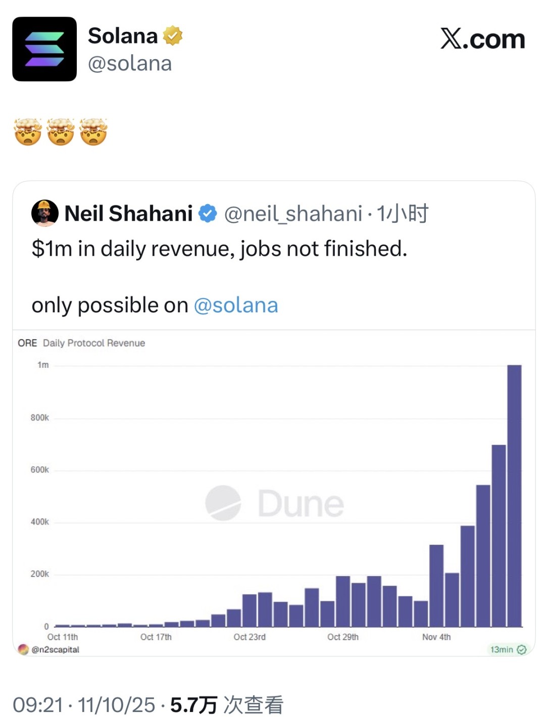 Solana 官方對此機制的獲利表現格外關注。11 月 10 日上午,Solana 官方轉載 ORE 增長負責人 Neil Shahani 推文,對其單日收入突破 100 萬美元表示驚訝。