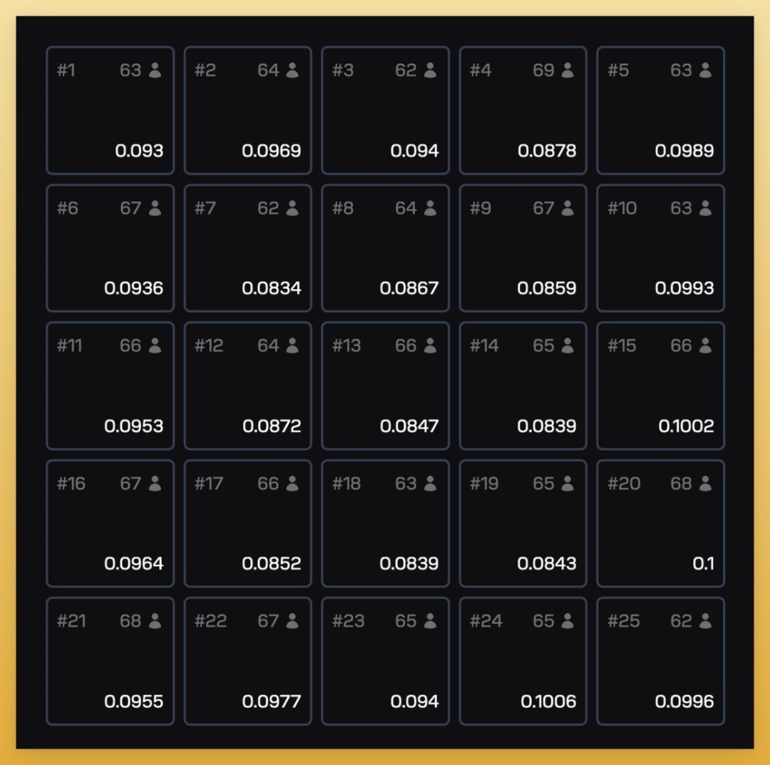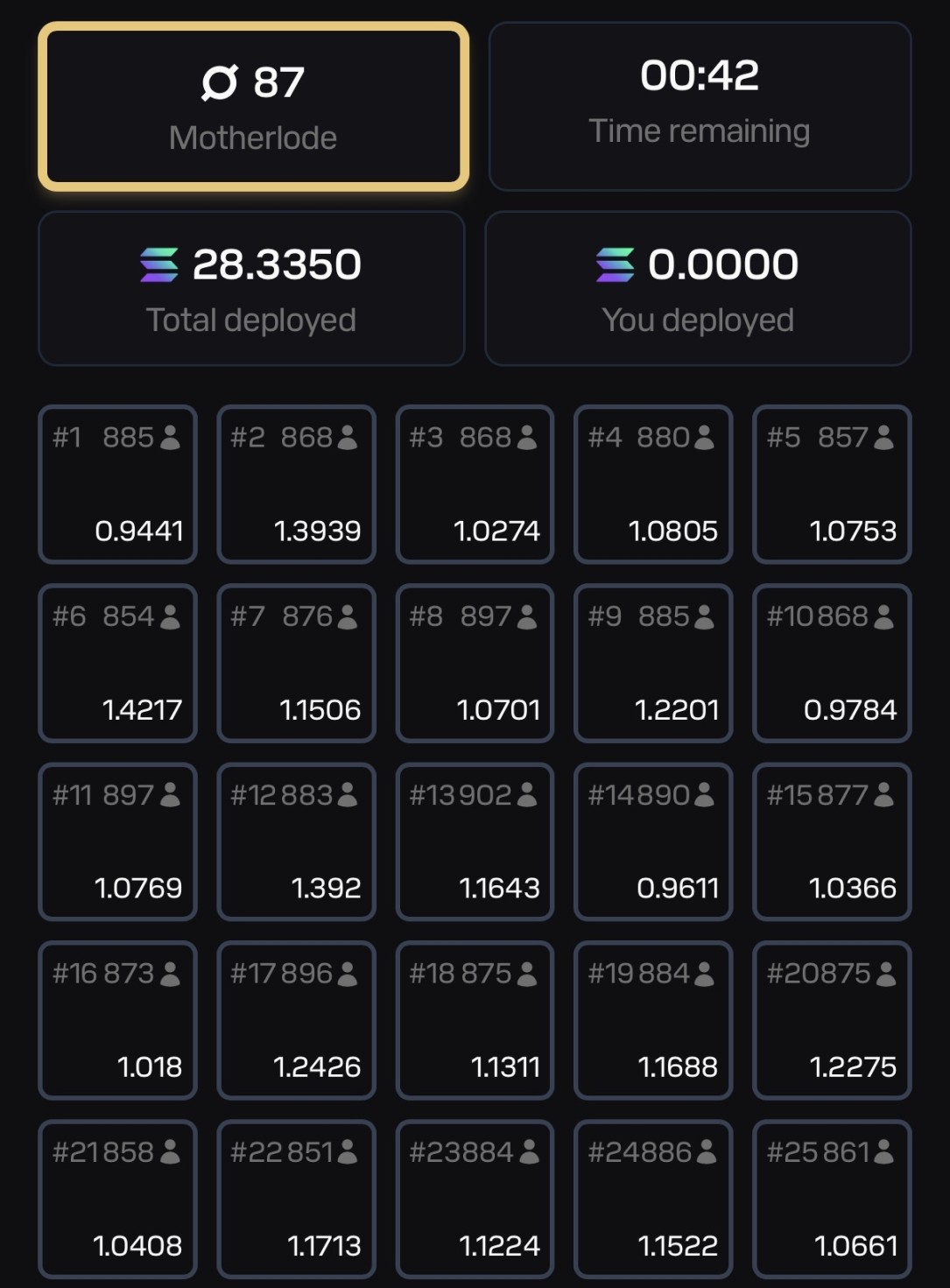 新協議創新導入 5×5 網格挖礦系統。每輪持續 1 分鐘,礦工透過部署 SOL 佔據網格區塊。每輪結束後,系統以安全隨機數產生器選出一個獲勝區塊,該區塊上的礦工按比例分得其他 24 個區塊的全部 SOL。此外,獲勝區塊內一名礦工還有機會獲得額外 1 枚 ORE 獎勵(約每三輪一次)。這種設計將「零和博弈」轉化為「集體價值再分配」,輸家投入的 SOL 全數流向贏家,避免價值外流。