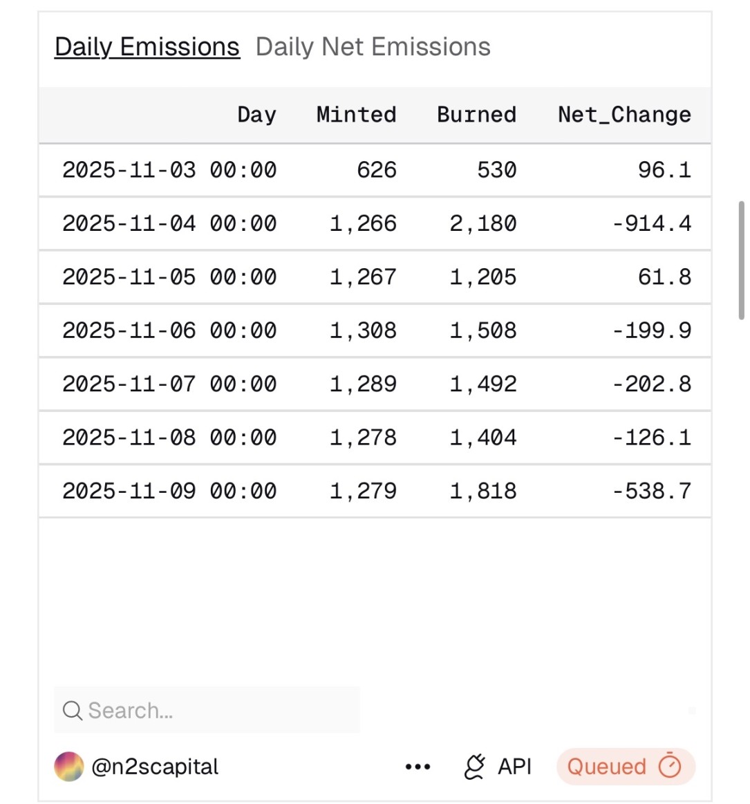 ORE 維持現行 500 萬枚代幣總供應上限,並維持約 1 枚 ORE / 分鐘的穩定平均發行率。但隨協議收入及自動銷毀機制導入,若協議收入充足,淨發行量將於有限通膨與無限通縮間波動。根據 Dune 數據,近七天有五天 ORE 處於通縮狀態。