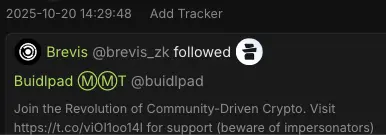 2、Brevis 官方帳號在 10 月 20 日關注了 Buidlpad 官方帳號。