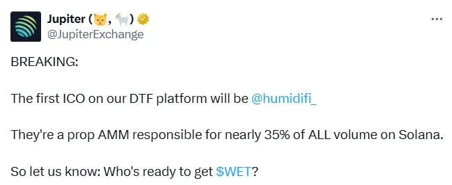 10 月 30 日,Jupiter 在 X 平台發文表示,其 DTF 平台上的首個 ICO 項目將是 HumidiFi。