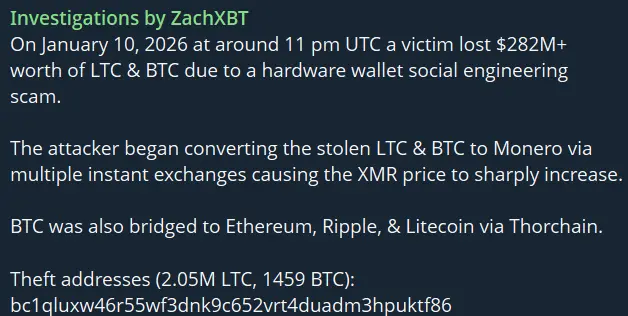 ZachXBT 揭露通过门罗币洗钱的 $282M BTC 和 LTC 盗窃案