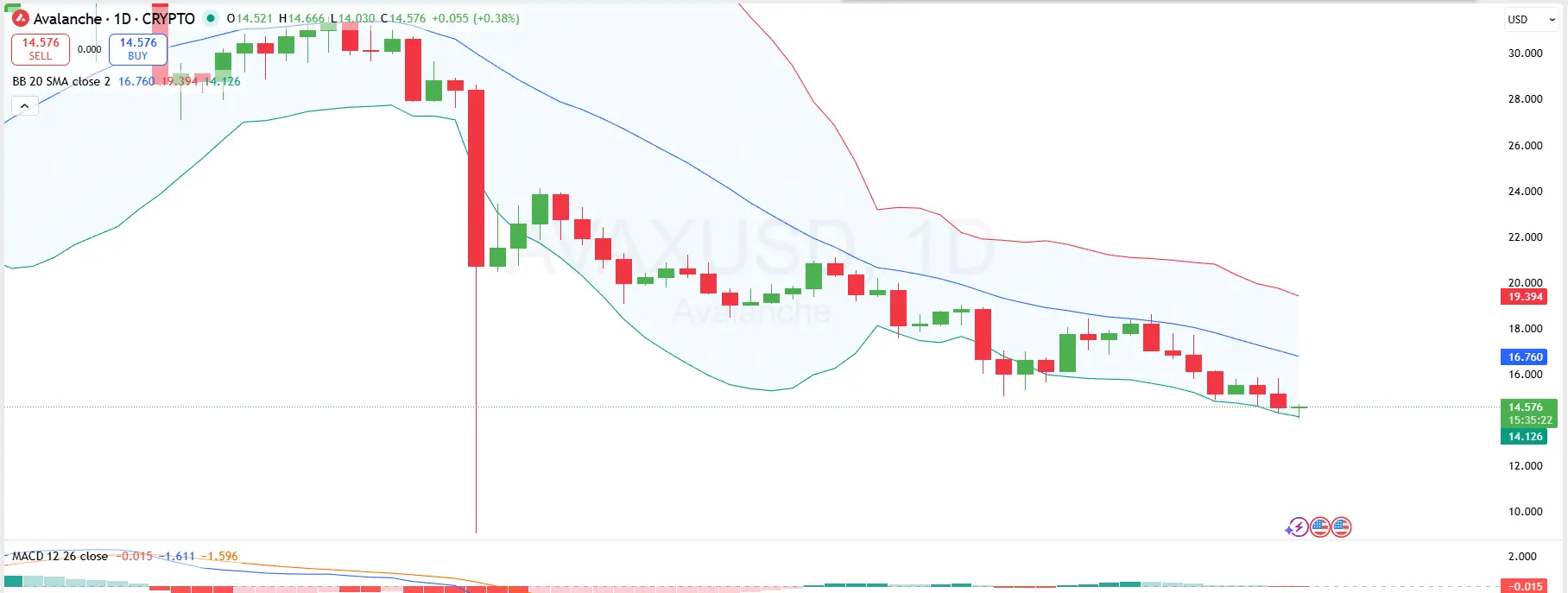 على الرسم البياني اليومي لـ AVAX، تشير المؤشرات الفنية إلى استمرار الاتجاه الهبوطي مع احتمال وجود تماسك قصير الأجل. يتداول السعر حاليًا فوق حد بولينجر السفلي، مما يشير إلى ظروف مفرطة البيع - وهي إشارة إيجابية محتملة على المدى الطويل.