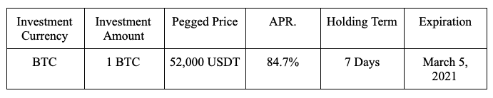 -When the settlement price is <52,000 USDT, BTC will be used as the settlement currency for the payback; the payback amount = 1 BTC*[(84.7% ÷ 365*7) + 1] ≈ 1.016 BTC