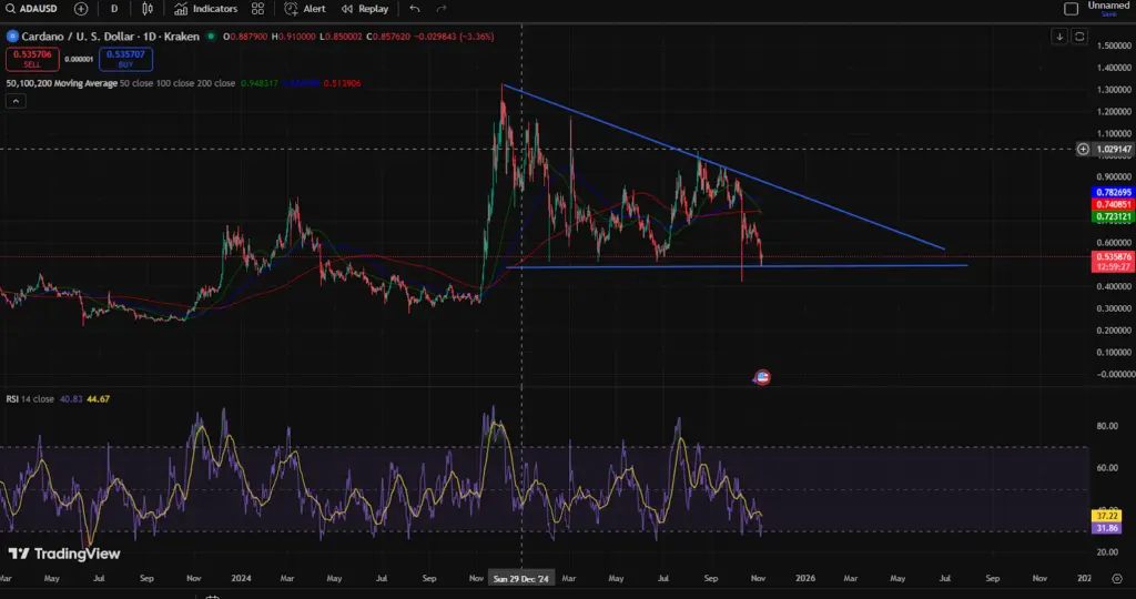 RSI berada di level oversold, harga berada di bawah 200MA, dan pola segitiga menurun telah terbentuk pada kerangka waktu harian