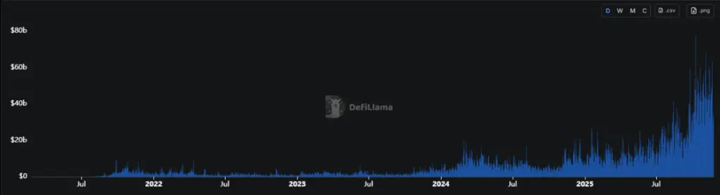 Meski harga aset utama menurun, aktivitas perdagangan futures perpetual di pasar secara keseluruhan tetap tinggi. Data DefiLlama menunjukkan volume perdagangan harian DEX berkisar antara 28 hingga 60 miliar dolar AS. Dalam 30 hari terakhir, empat platform utama—Lighter, Aster, Hyperliquid, dan EdgeX—memproses transaksi senilai lebih dari 1 triliun dolar AS.