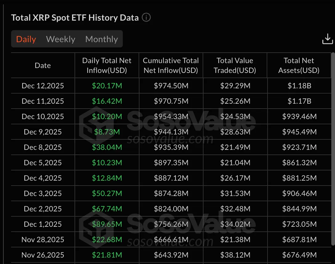 Data menunjukkan ETF spot XRP telah menarik modal baru setiap hari perdagangan sejak peluncuran, meningkatkan total arus masuk bersih menjadi sekitar $975 juta per 12 Des. Total aset bersih dari produk-produk ini telah naik menjadi sekitar $1,18 miliar, tanpa ada sesi penebusan bersih yang tercatat.