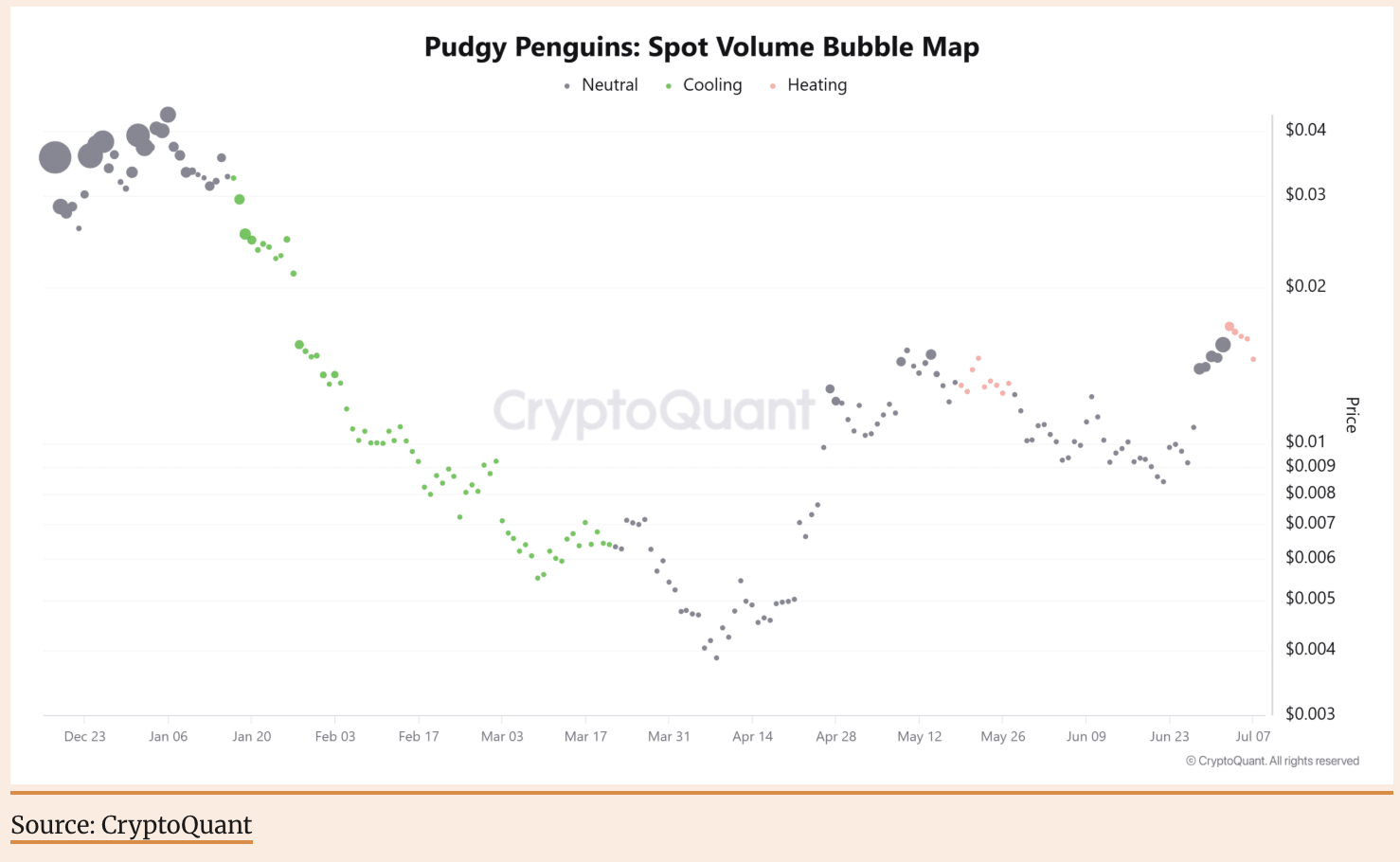 4. 取引量の増加:市場参加の増加の兆候 取引量バブルチャート (Volume Bubble Map) によると、PENGUの現物取引量は「温度上昇 (Heating)」段階に入ったことを示しており、これは市場参加度の著しい向上を示しています。この段階は通常、暗号通貨価格の動きの強化および取引所間の可視性の拡大と一致します。 したがって、価格が重要な構造サポートレベルの上に安定している間に、取引量の急増の傾向が続く場合、これはブレイクスルートレンドの初期段階が形成されている可能性を示しているかもしれません。 トレーダーは、強気のK線形態に伴って取引量が著しく増加する現象が現れるかどうかを注意深く監視する必要があります。これは、価格がより高いフィボナッチ目標値に移動することを確認するための根拠となります。