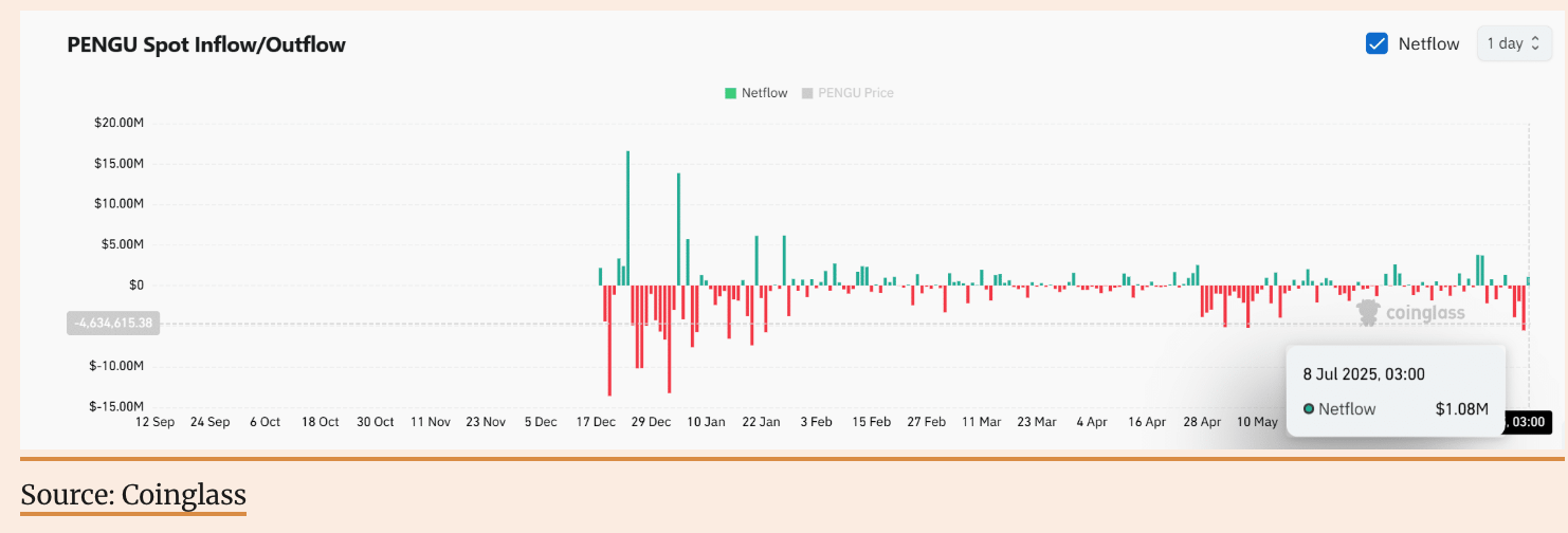 2. チェーン上の資金流入が急増:信念の強化か、それとも短期的な反応か? 執筆時点で、PENGU 現物市場は 108万ドルの純資金流入 を記録しました —— これは 暗号投資家の関心が再燃した 強力な指標です。 ここ数週間、資金の流れは全体的に平坦でしたが、今回の資金の急激な逆転は、市場の暗号通貨の感情が転換点を迎える可能性を示唆しています。通常、この規模の資金流入は、トークン蓄積段階や潜在的な強気継続形態と関連しています。 したがって、もし百万ドル規模の資金流入を持続的に維持できれば、特に取引量の増加と価格動向の確認が伴う場合、PENGUの需要が強まるという強力な証拠となるでしょう。