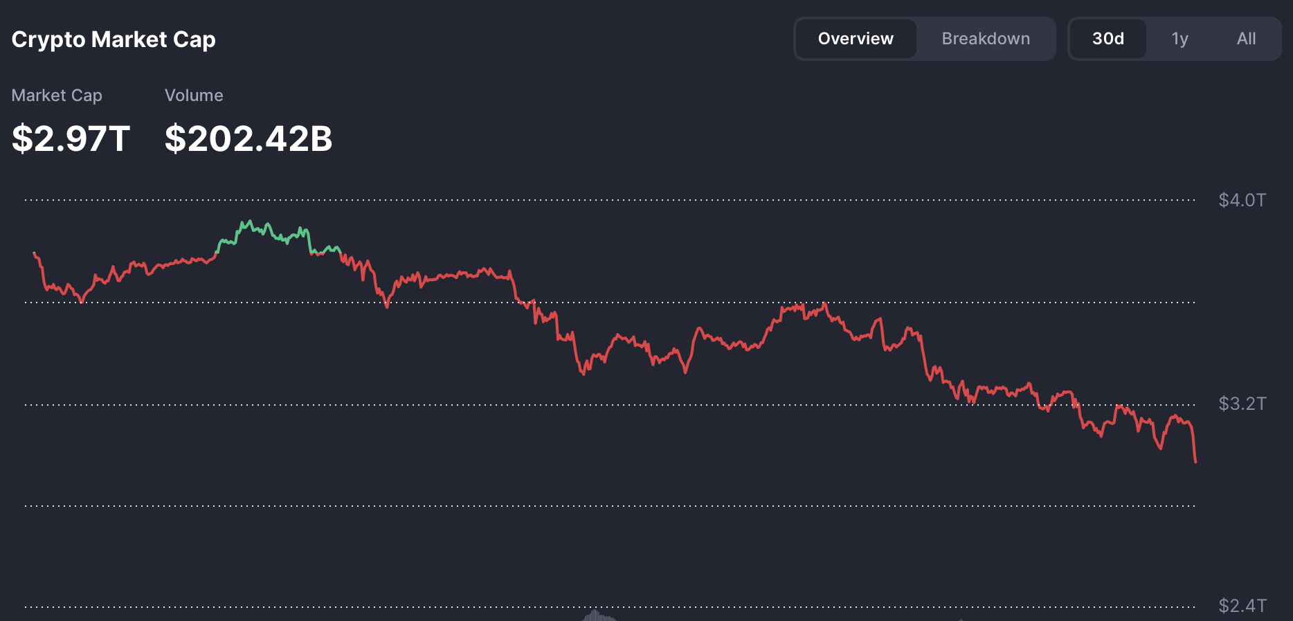 暗号資産市場は$3 兆を下回る落ち込みを見せ、連邦準備制度の不確実性が広範な売りを引き起こす