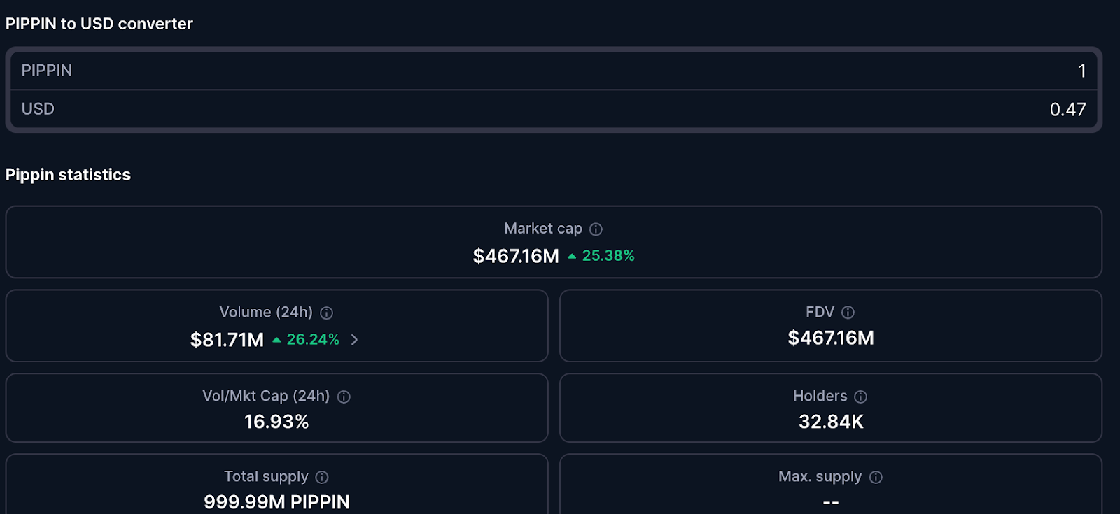 報告された時価総額は$497 百万ドル近くで、24時間の取引量はおよそ$77 百万ドルです。市場データは、PIPPINの総供給量を約10億トークン未満とリストしており、ほぼ全量が流通していると報告されています。