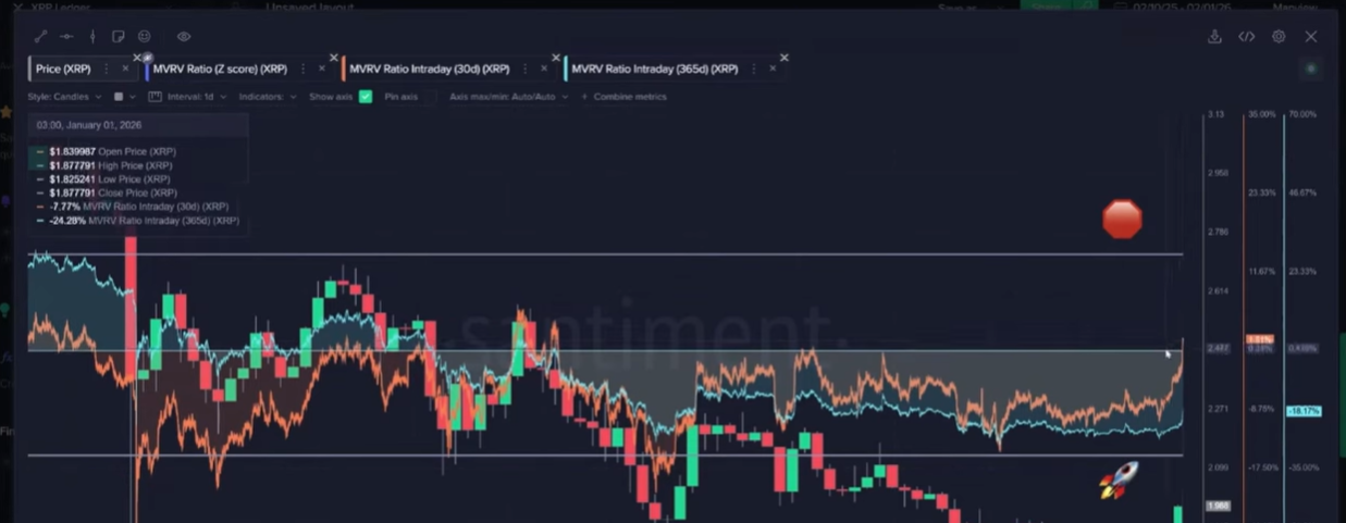 Santimentのアナリスト、ブライアン・クインリヴァンは、XRPの市場価値と実現価値を比較した指標であるMVRVをレビューしました。彼は、最近のラリーにより、XRPの30日間MVRVがわずかにプラス圏に戻ったと述べており、その値は約1.5%です。