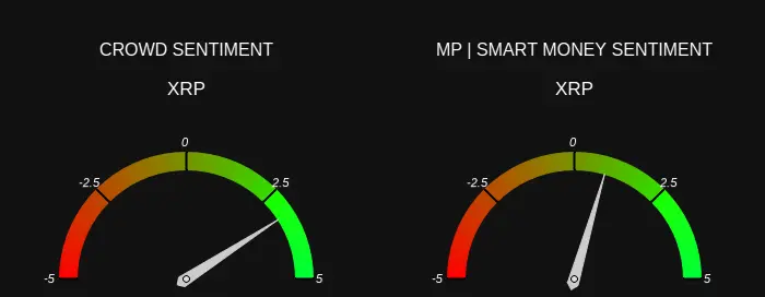 状況が改善しているにもかかわらず、新しいセンチメント指標は、リテールトレーダーと機関投資家の間での乖離が拡大していることを示しています。最近のデータでは、XRPの群衆センチメントは3.17であり、強いリテールの楽観主義を示しています。一方、スマートマネーのセンチメントは0.90付近で、機関投資家の信頼感は控えめです。
