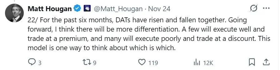 Bitwise首席投资官Matt Hougan表示,过去六个月显示DATs往往会同步波动,一同上涨和下跌。