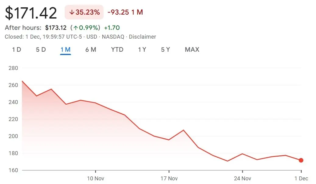 谷歌财经数据显示,战略部门最大的DAT在一个月内下跌了35.23%,从11月3日的264.67美元降至撰写时的171.42美元。