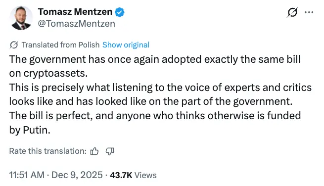 「政府は再び、暗号資産に関するまったく同じ法案を採択した」とメンツェンは火曜日のX投稿で書いた。