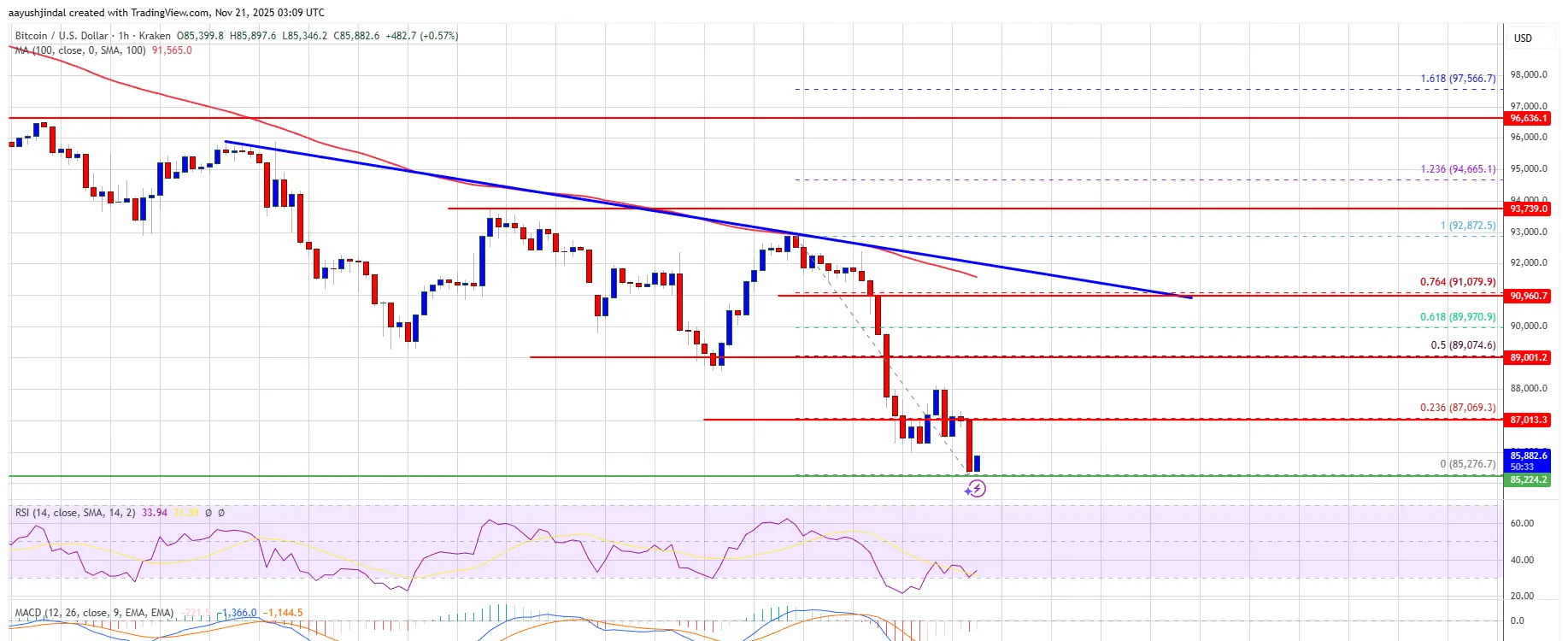 Os ursos ganharam força e conseguiram empurrar o preço abaixo da zona dos $87,500. Foi formado um mínimo a $85,276, e o preço está agora a consolidar perdas abaixo do nível de retração de 23,6% de Fib da recente queda desde o máximo de $92,872 até ao mínimo de $85,276.