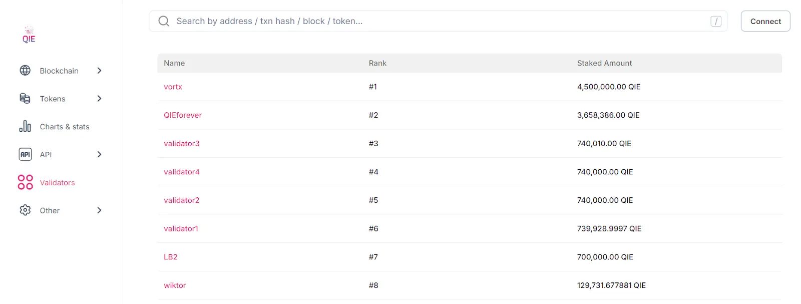 Todos os meses, 50.000 QIE são distribuídos aos validadores. Esta distribuição ocorrerá ao longo de aproximadamente 100 anos.